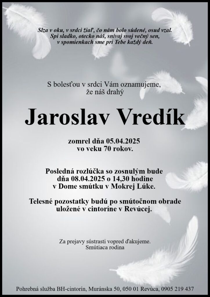 Smútočné oznámenie, Jaroslav Vredík (†70)