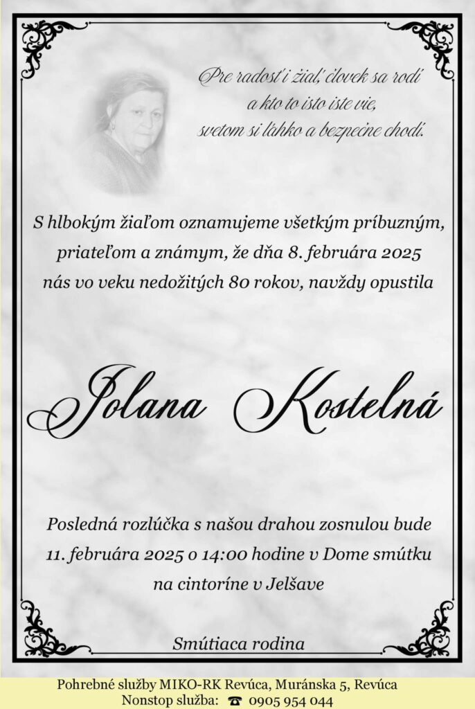 Smútočné oznámenie, Jolana Kostelná (†79)
