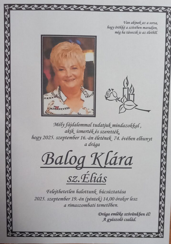 Smútočné oznámenie, Klára Balog, rod. Éliás (†74)