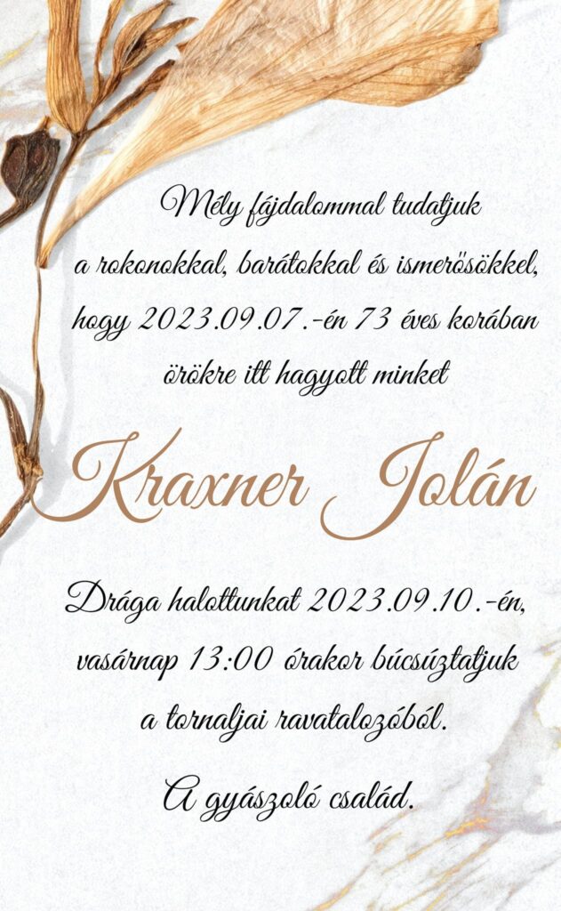 Smútočné oznámenie - Kraxner Jolán (†73)