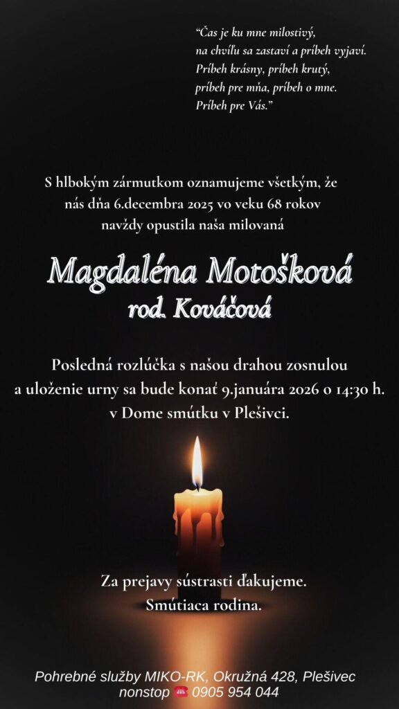 Smútočné oznámenie, Magdaléna Motošková, rod. Kováčová (†68)