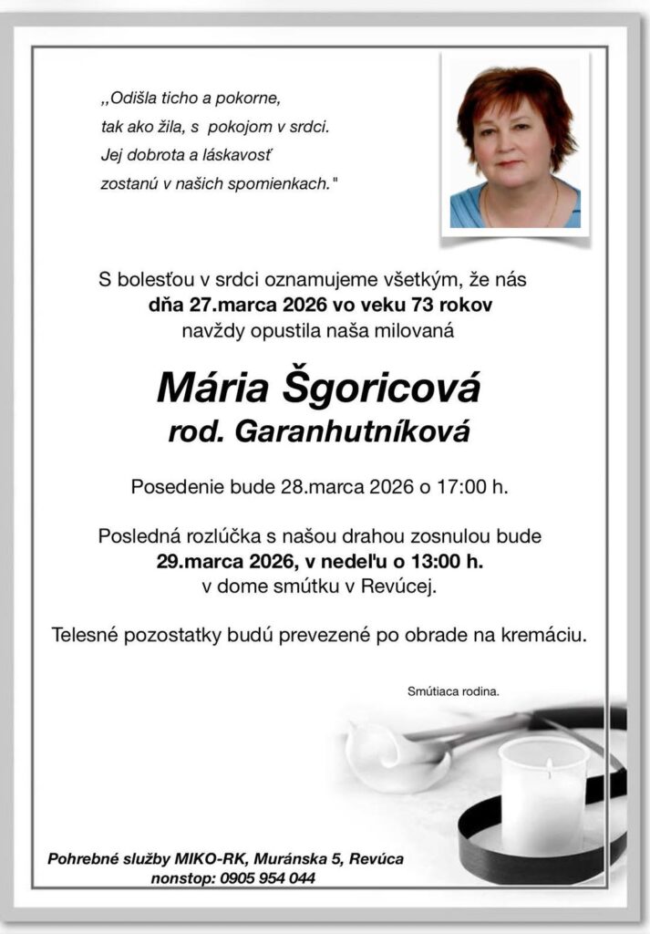 Smútočné oznámenie, Mária Šgoricová rod. Garanhutníková (†73)