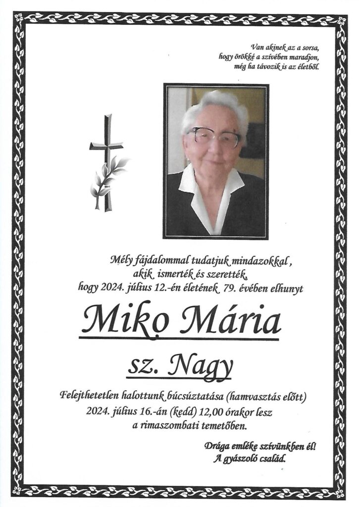 Smútočné oznámenie - Miko Mária, rod. Nagy (†79)