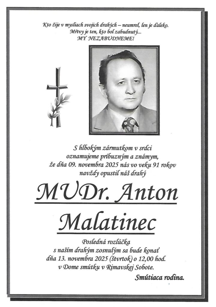 Smútočné oznámenie, MUDr. Anton Malatinec  (†91)