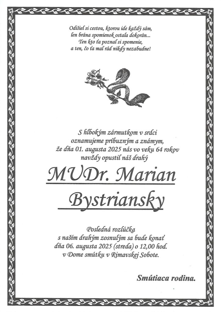 Smútočné oznámenie, MUDr. Marian Bystriansky (†64)