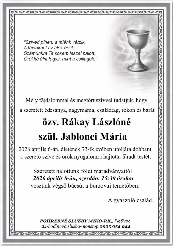Smútočné oznámenie, özv. Rákay Lászlóné, szül. Jablonci Mária (†73)