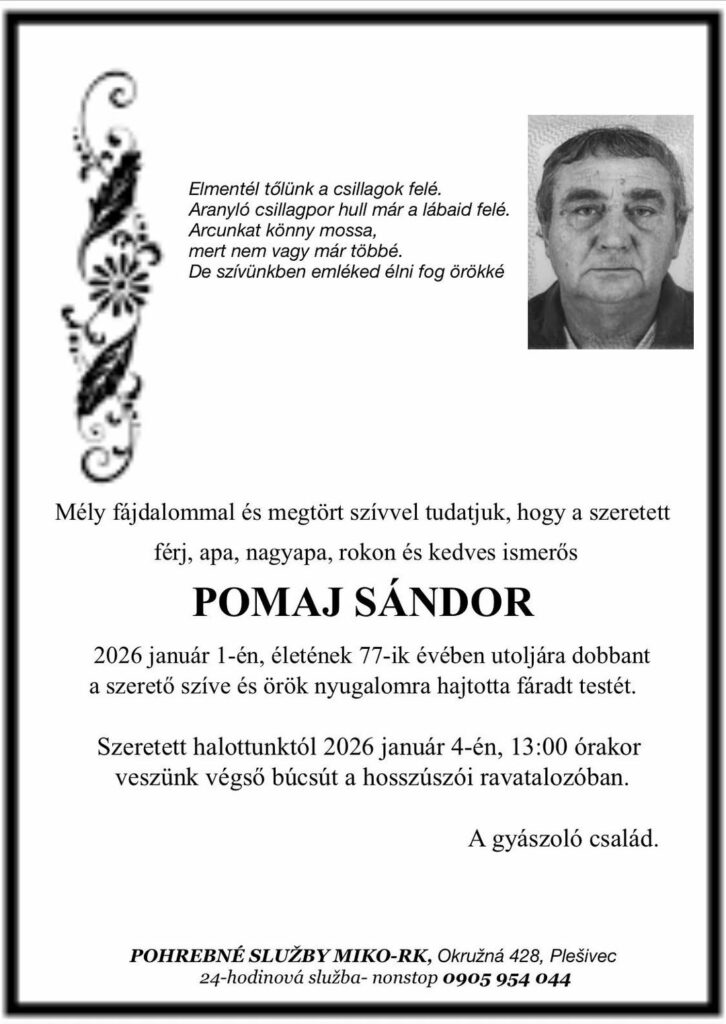 Smútočné oznámenie, Pomaj Sándor (†77)