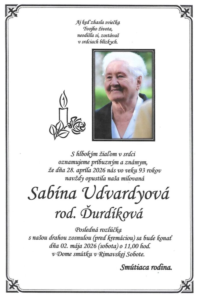 Smútočné oznámenie, Sabína Udvardyová, rod. Ďurdíková (†93)