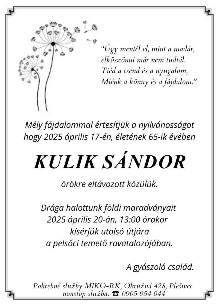 Smútočné oznámenie, Sándor Kulik (†65)