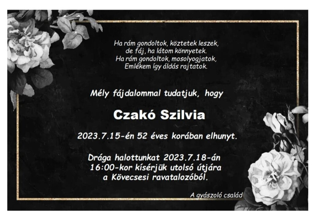 Smútočné oznámenie - Szilvia Czakó (†52)
