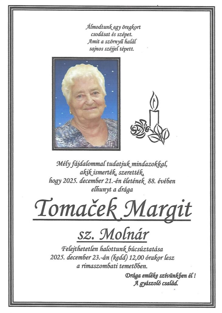 Smútočné oznámenie, Tomaček Margit, sz. Molnár (†88)