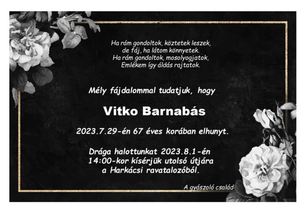 Smútočné oznámenie - Vitko Barnabás (†67)