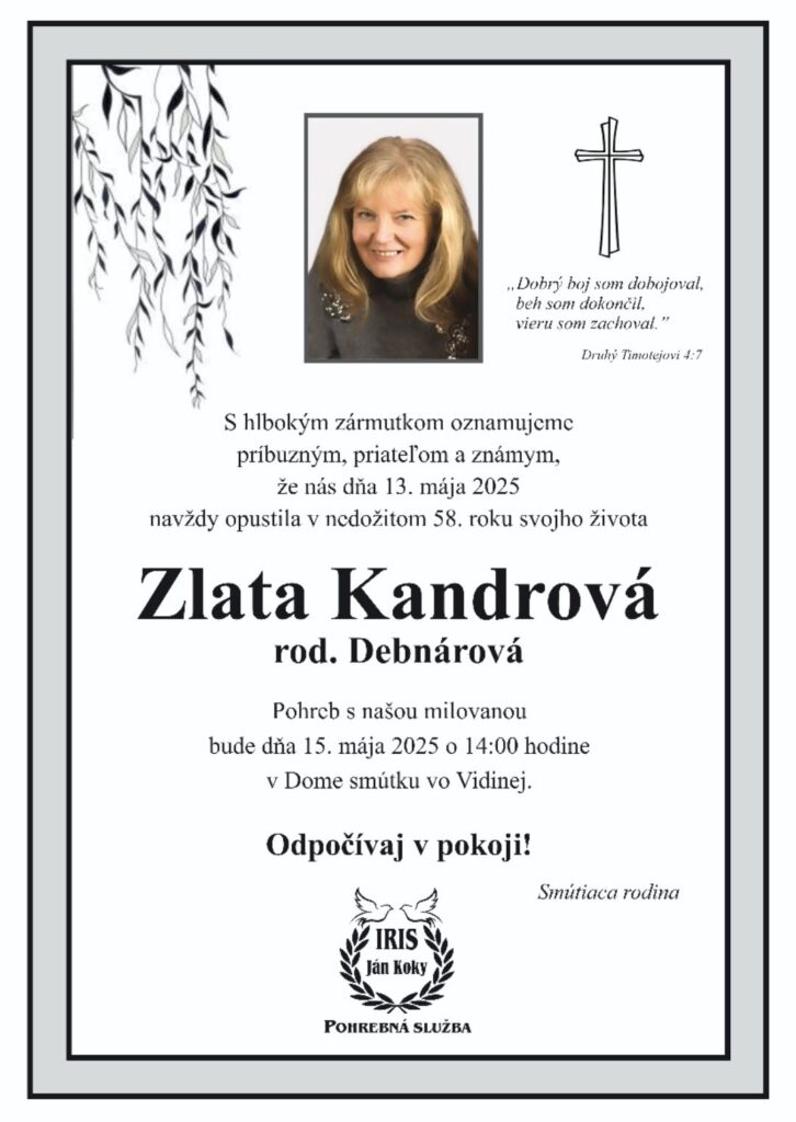Smútočné oznámenie, Zlata Kandrová, rod. Debnárová (†57)