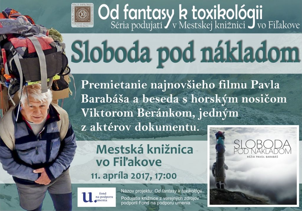 Hradné múzeum vo Fiľakove Vás srdečne pozýva na ďalšie zo série podujatí s názvom „Od fantasy k toxikológií“. Tentokrát Vás čaká premietanie najnovšieho filmu Pavla Barabáša „Sloboda pod nákladom“, ktorý Vám následne v rámci besedy priblíži jeden z jeho aktérov, Viktor Beránek.