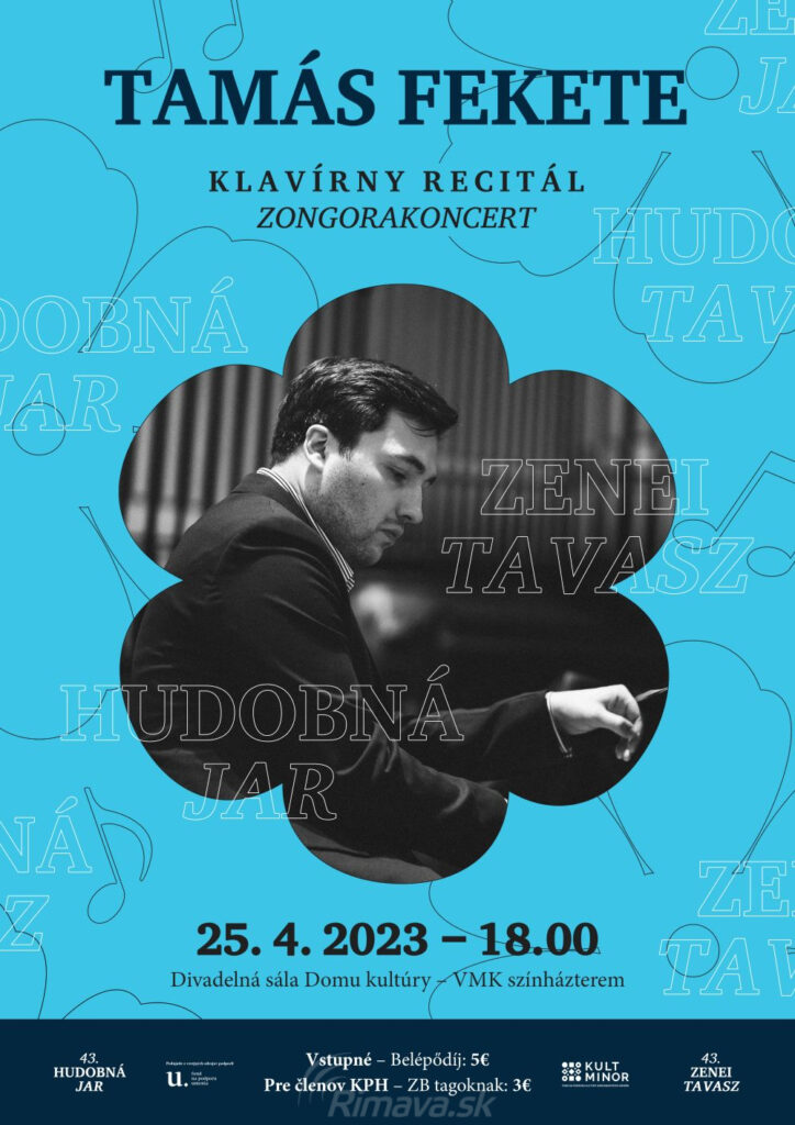 Všetkých milovníkov krásnej hudby pozývame v utorok, 25. 4. o 18.00 hod. do divadelnej sály DK na tretí koncert 43. ročníka Hudobnej jari, ktorým bude klavírny recitál Tamása Feketeho. Mladý umelec je držiteľom viacerých medzinárodných ocenení ako aj finalista súťaže maďarskej televízie „Virtuózok 2018".