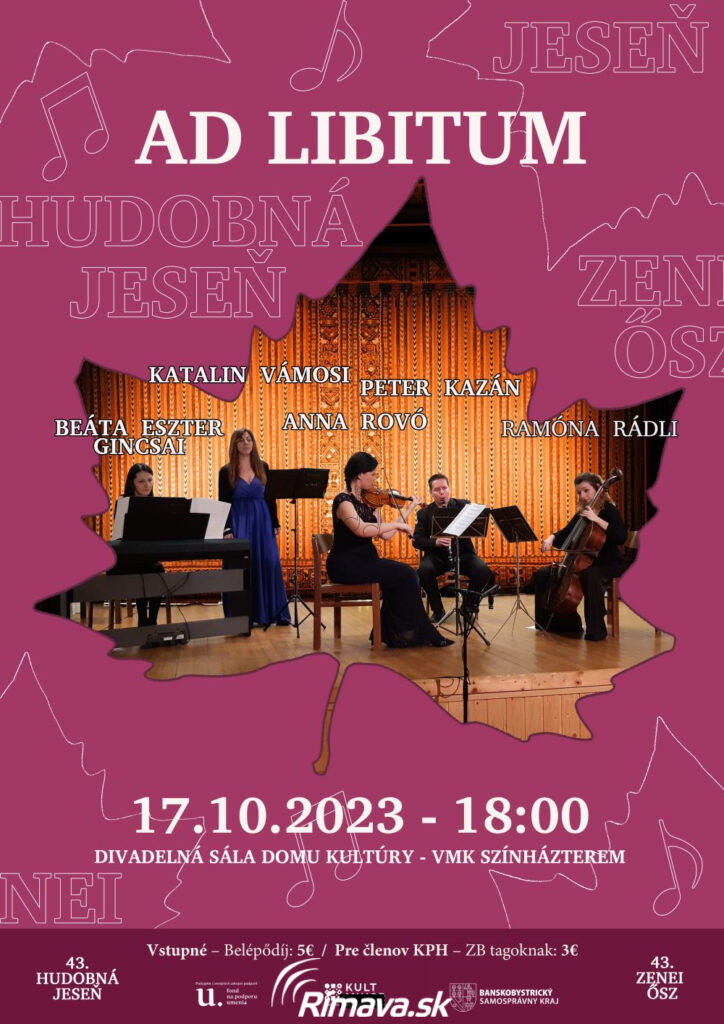 V utorok, 17. 10. o 18.00 hod. v divadelnej sále DK čakáme na milovníkov vážnej hudby. Hosťom Hudobnej jesene bude klavírne kvinteto Ad Libitum v zložení Katalin Vámosi /spev, Anna Rovó /husle, Peter Kazán /klarinet, Ramóna Rádli /violončelo a Beáta Eszter Gincsai / klavír. Vstupné: 5€ / členovia KPH 3€, predaj pred koncertom. Tešíme sa na Vás! Koncerty Hudobnej jesene z verejných zdrojov podporuje Banskobystrický samosprávny kraj, Fond na podporu umenia a Fond na podporu kultúry národnostných menšín.