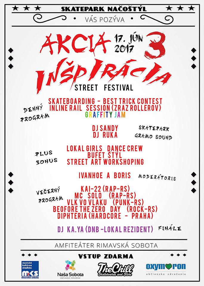 Pozývame ťa v sobotu, 17. 6. od 10.00 hod. do rimavskosobotského skateparku Načoštýl. Nájdeš nás v Amfiku. Organizujeme streetový jednodňový festival Akcia Inšpirácia, ktorý propaguje umenie, hudbu a šport ulice ... Uvidíš amatérsku súťaž v skateboardingu v disciplíne najlepší trik, grafitty jam na legál panely natreté a nachystané pre writerov, inline spoločný pojazd, zraz bladerov Slovenska... a kopec hudby k tomu. Kukni plagát a dojdi sa motivovať, nakopnúť, hecnúť, nabiť, naladiť sa na našu uličnú akciu, ktorá má už svoje tretie pokračovanie, ale teraz je to úplne najväčšia pecka. Zábava úplne zdarma až do noci.