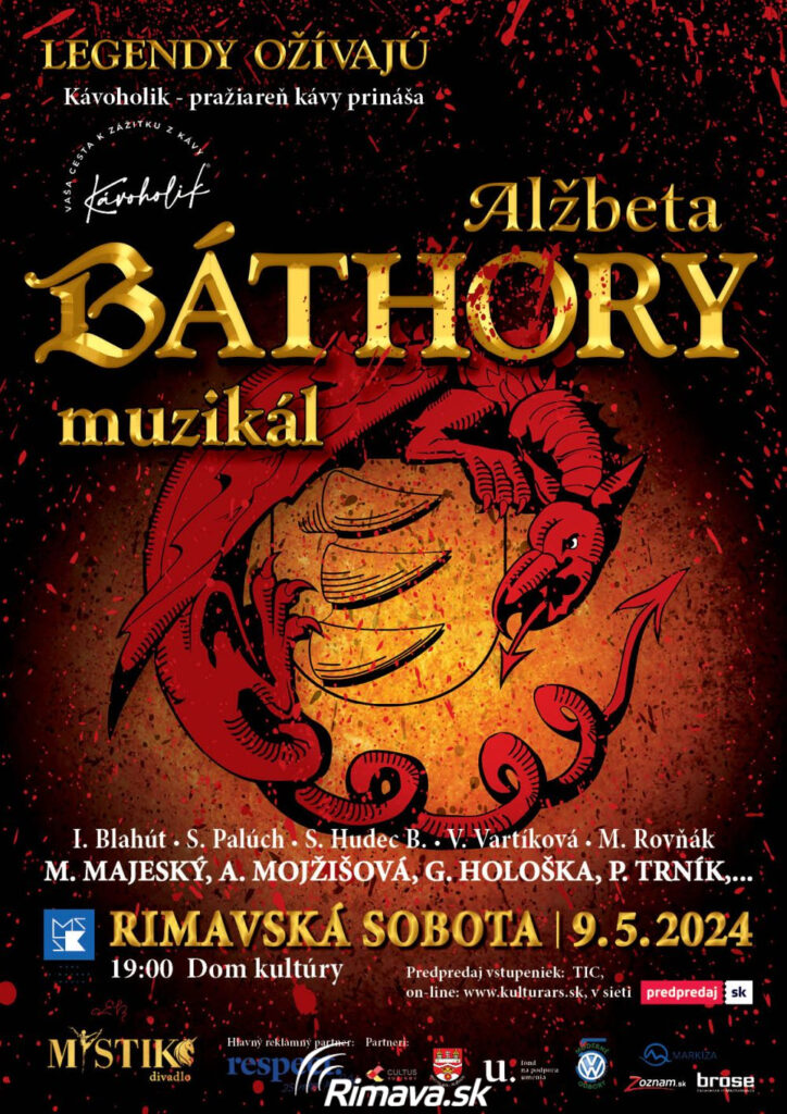 Legenda sa vracia! Príbeh krvavej grófky, ktorá sa stala legendou už 9.5. o 18.00 hod. v Rimavskej Sobote! Muzikál s hviezdnym hereckým obsadením, príbeh o nenaplnených túžbach v srdci Alžbety Báthory, v ktorej prebudia draka. Magický príbeh o silnej, vzdelanej a krásnej grófke, ktorá túži po večnej mladosti. Originálne a jedinečné spojenie legendárneho príbehu, sugestívnej pôvodnej hudby a podmanivého temperamentu slovenského folklóru s fúziou autorskej hudby a World music. Vstupné: 32€, predaj vstupeniek v DK, Kine Orbis a online na www.kulturars.sk.