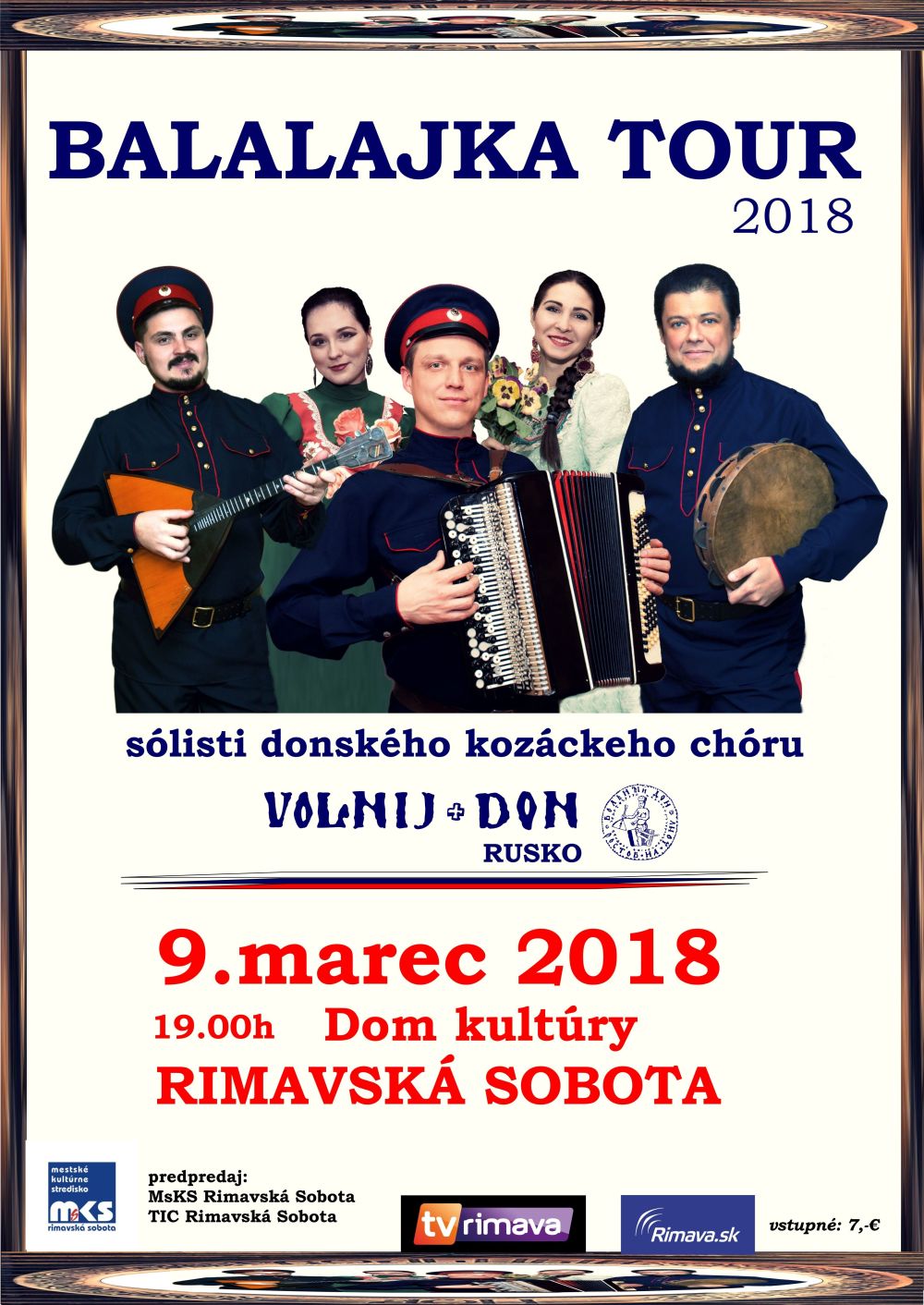 Sólisti Donského kozáckeho chóru Volnij Don prichádzajú do Rimavskej Soboty s novým programom BALALAJKA 2018. V piatok, 9. 3. 2018 o 19.00 hod., zaznejú v ich podaní známe, veselé a clivé ruské melódie. S tradičnými ruskými hudobnými nástrojmi, bajanom, balalajkou, ale hlavne s neopakovateľnými hlasmi a skvelou energiou, prichádzajú siedmykrát na Slovensko, aby zaspievali piesne rodného kraja. Vstupné: 7€, predpredaj MsKS a TIC od 22. 1. 2018.