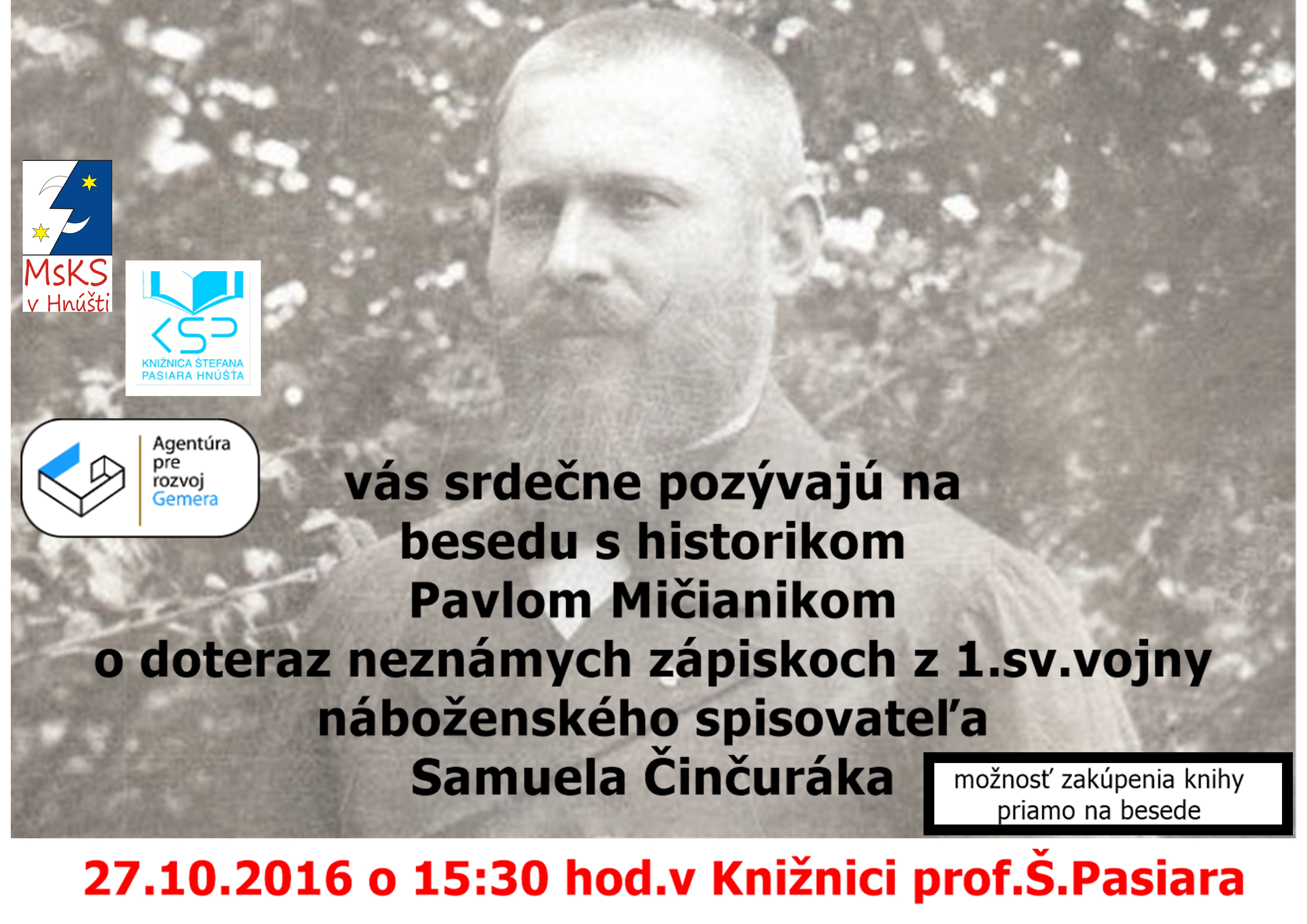 MsKS v Hnúšti v spolupráci s Agentúrou pre rozvoj Gemera vás srdečne pozývajú na besedu s historikom Pavlom Mičianikom o doteraz neznámych zápiskoch z 1.sv.vojny náboženského spisovateľa Samuela Činčuráka.