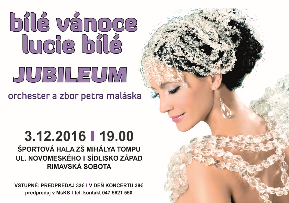 Niekoľkonásobná držiteľka Zlatého slávika Lucie Bíla oslavuje svoje jubileum vianočnými koncertmi na Slovensku! Nezabudnuteľnú show s orchestrom a speváckym zborom Petra Maláska predstaví aj v Rimavskej Sobote, v sobotu, 3. decembra o 19.00 hod. v divadelnej sále Domu kultúry. Vstupné: 39€ / predpredaj v TIC a MsKS.
