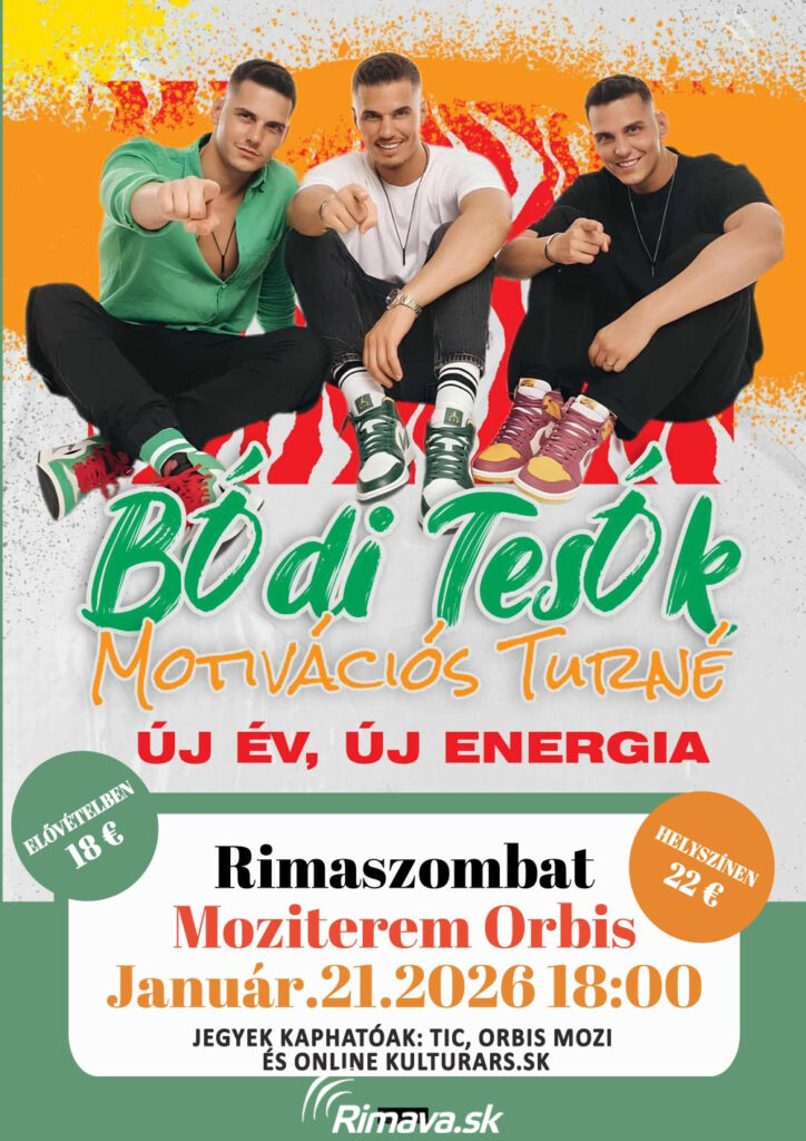 A Bódi Tesók először érkeznek Szlovákiába motivációs turnéval. A testvértrió őszinte, életteli és inspiráló gondolataival arra ösztönzi a közönséget, hogy higgyenek magukban, merjenek változtatni és új lendülettel indítsák az évet. A Motivációs Turné – Új Év, Új Energia különleges est, amely erőt, reményt és pozitív