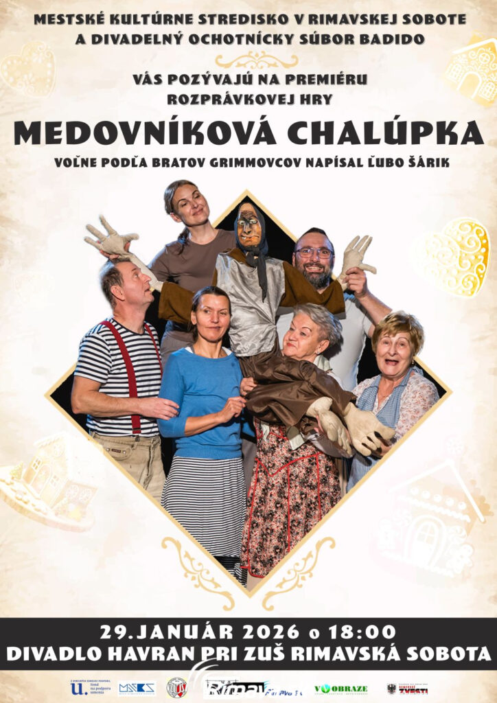 Pozývame Vás v mene ochotníkov z bábkarského divadelného súboru BADIDO na presunutú premiéru rozprávkovej hry MEDOVNÍKOVÁ CHALÚPKA, ktorú pre potreby súboru voľne podľa bratov Grimmovcov napísal Ľubo Šárik. Premiéra sa na druhý pokus uskutoční 29. januára 2026 o 18.00 hod. v divadle HAVRAN pri ZUŠ.