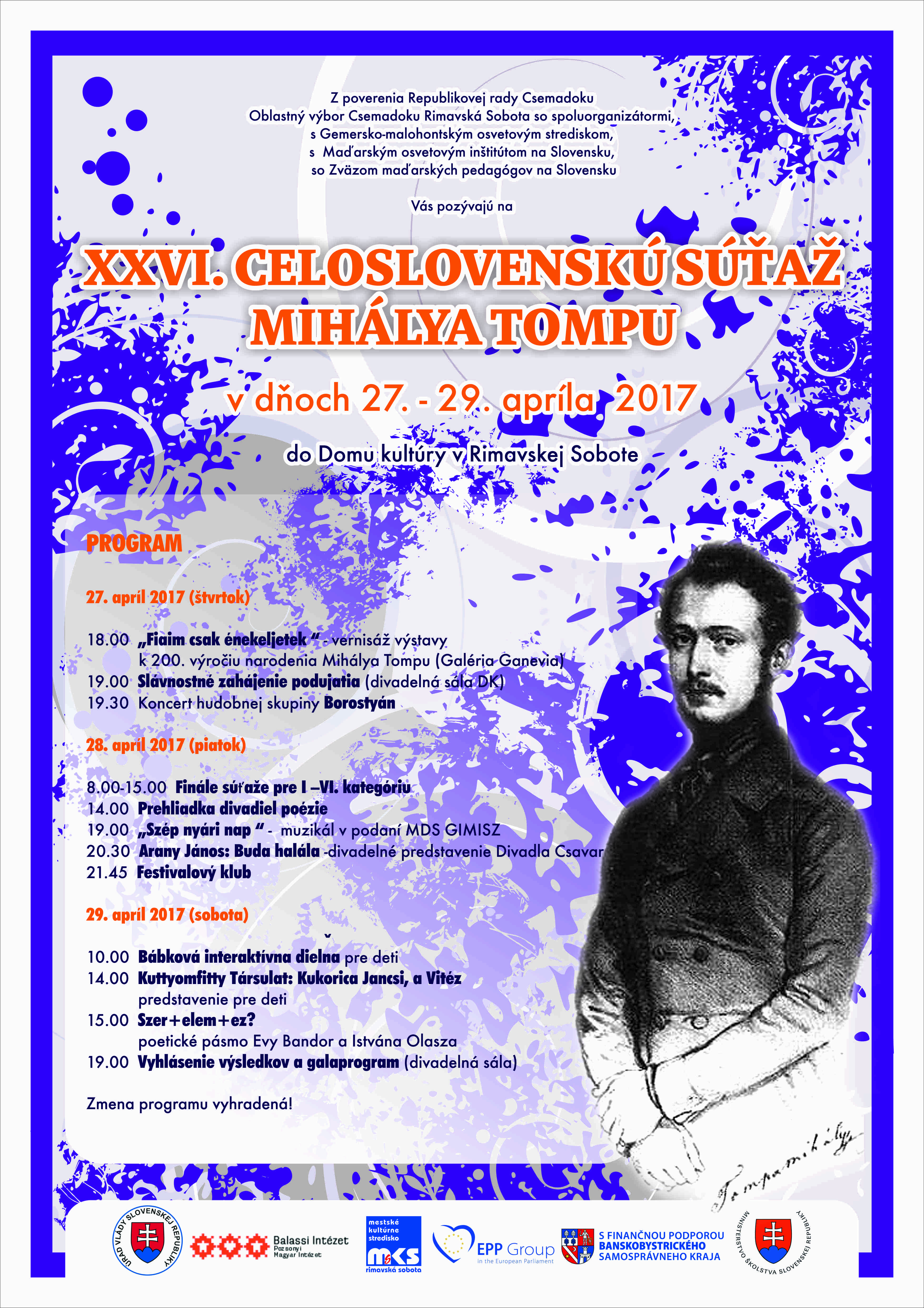 Posledný aprílový víkend v Rimavskej Sobote tradične patrí umeleckému prednesu poézie a prózy, zhudobnených básní a divadla poézie v maďarskom jazyku. V Dome kultúry už 26-krát sa uskutoční Celoštátna súťaž Mihálya Tompu. Na trojdňové podujatie pricestuje do Rimavskej Soboty vyše 350 ľudí z celého južného Slovenska: súťažiaci, ich učitelia a rodičia. Súťaží sa v siedmich kategóriách od najmladších až po dospelých. Organizátori pripravili bohaté sprievodné podujatia, ktoré sú zdarma prístupné aj širokej verejnosti. Zhudobnenými básničkami sa predstaví publiku Skupina Borostyán z Komárna, hercov Jókaiho divadla, Evu Bandor a Istvána Olasza uvidíme v poetickom pásme Szer+elem+ez, študenti Gymnázia Jánosa Sellyeho vystúpia s musicalom z hitov rockovej kapely Neoton Família, Divadlo Csavar zahrá hru od Jánosa Aranya „Buda halála“ a najmenších zabaví s interaktívnou rozprávkou Kuttyomfitty Társulás z Veľkého Medera. Slávnostné vyhlásenie výsledkov súťaže a galaprogram bude 29. apríla v sobotu o 19.00 hod. v divadelnej sále.