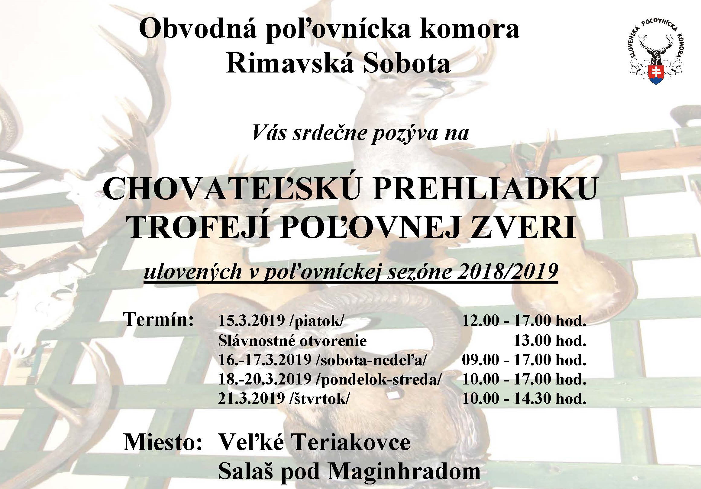 Chovateľská prehliadka trofejí poľovnej zveri ulovených v poľovníckej sezóne 2018/2019 v poľovných revíroch okresu Rimavská Sobota.