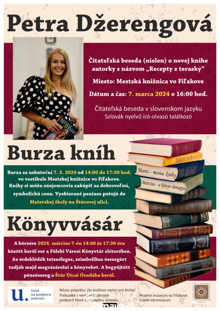 Hradné múzeum vo Fiľakove pozýva milovníkov literatúry na čitateľskú besedu s obľúbenou spisovateľkou Petrou Džerengovou, ktorá sa uskutoční 7. marca 2024 o 16:00 hodine, v Mestskej knižnici.