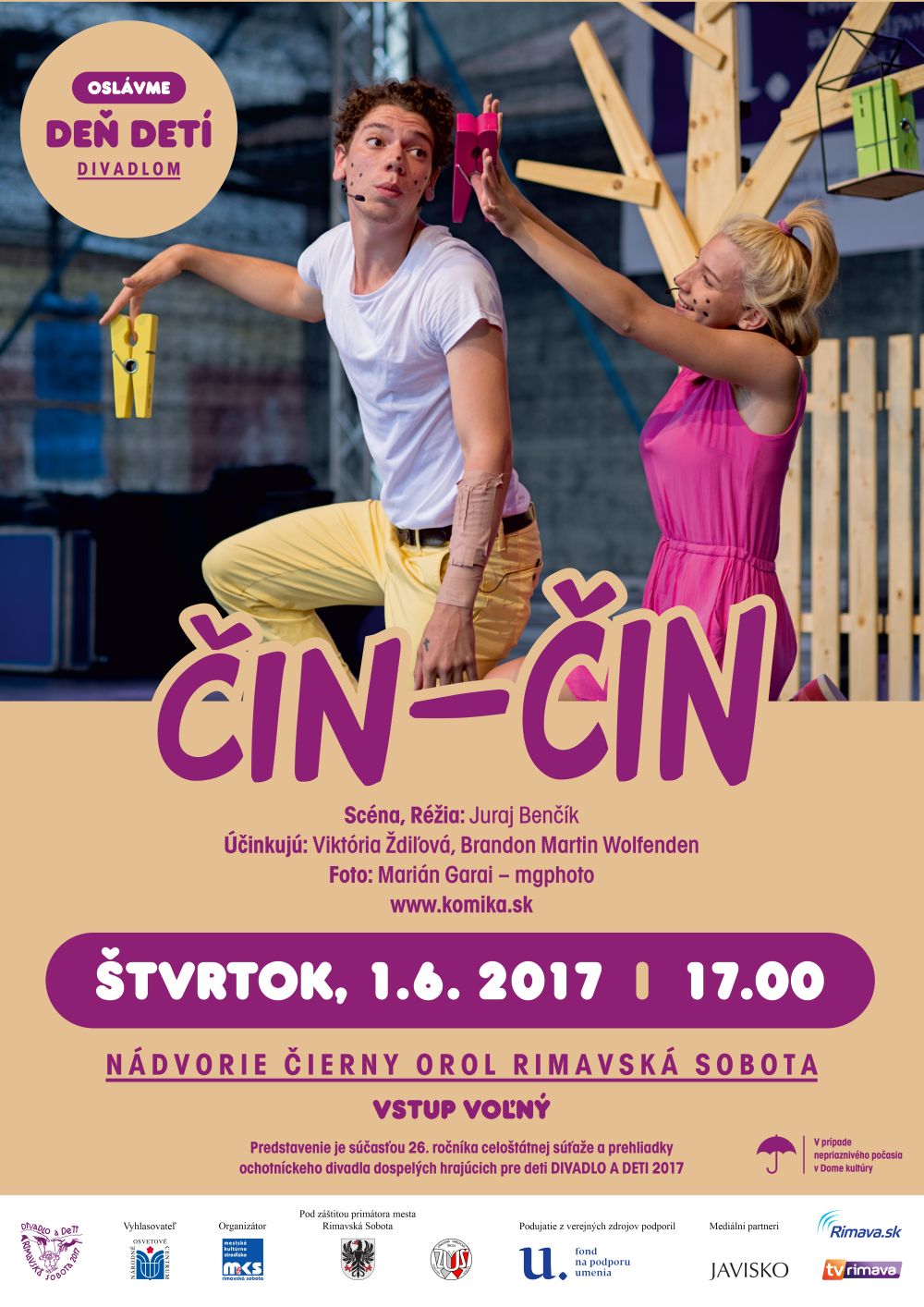 Pozývame všetkých maličkých osláviť ich sviatok vo štvrtok, 1. 6. o 17.00 hod. do Čierneho orla na rozprávku plnú vrabčekov a lastovičiek. Divadlo Komika sa vám predstaví s legendárnou rozprávkou Čin - Čin o poučných dobrodružstvách malého lenivého vrabčiaka Čima na motívy Ľudmily Podjavorinskej v trošku netradičnom formáte. Scénu, nápadité kulisy i kostýmy navrhol umelecký šéf divadla, klaun Cirque du Soleil Juraj Benčík. Geniálne využitie jednoduchosti ku dosiahnutiu veľkého efektu. Vstup zdarma. Predstavenie je súčasťou programu 26. ročníka celoštátnej súťaže a prehliadky Divadlo a deti 2017. Prehliadku z verejných zdrojov podporil FPU a NOC.