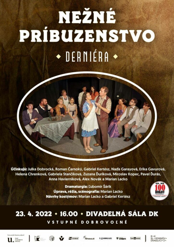 Občianske združenie pri Základnej umeleckej škole (ZUŠ) a Mestské kultúrne stredisko pozývajú všetkých milovníkov divadla, literatúry a miestnej histórie na skvelé sobotné popoludnie (23. 4. 2022), počas ktorého miestni ochotníci v Dome kultúry odohrajú derniéru hry Nežné príbuzenstvo (16.00 hod.) a následne pokrstia knihu s názvom Denník storočnej dámy (18.00 hod.), ktorá je súhrnom histórie divadelných udalostí v meste Rimavská Sobota od začiatku 19. storočia po súčasnosť.