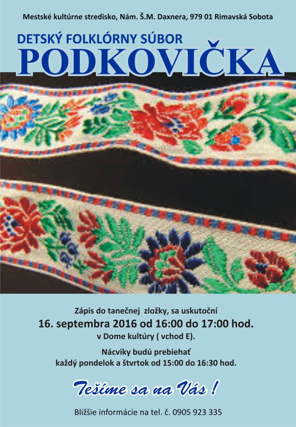 Detský folklórny súbor Podkovička pri MsKS pozýva všetkých malých záujemcov o folklór na zápis do tanečnej zložky, ktorý sa uskutoční v piatok 16. 09. 2016 od 16.00 do 17.00 hod. v Dome kultúry (vchod E). Nácviky budú prebiehať každý pondelok a štvrtok od 15.00 – 16.30 hod. Bližšie informácie na tel. č. 0905 923 335, V. Petrinec, vedúci FS Rimavan.