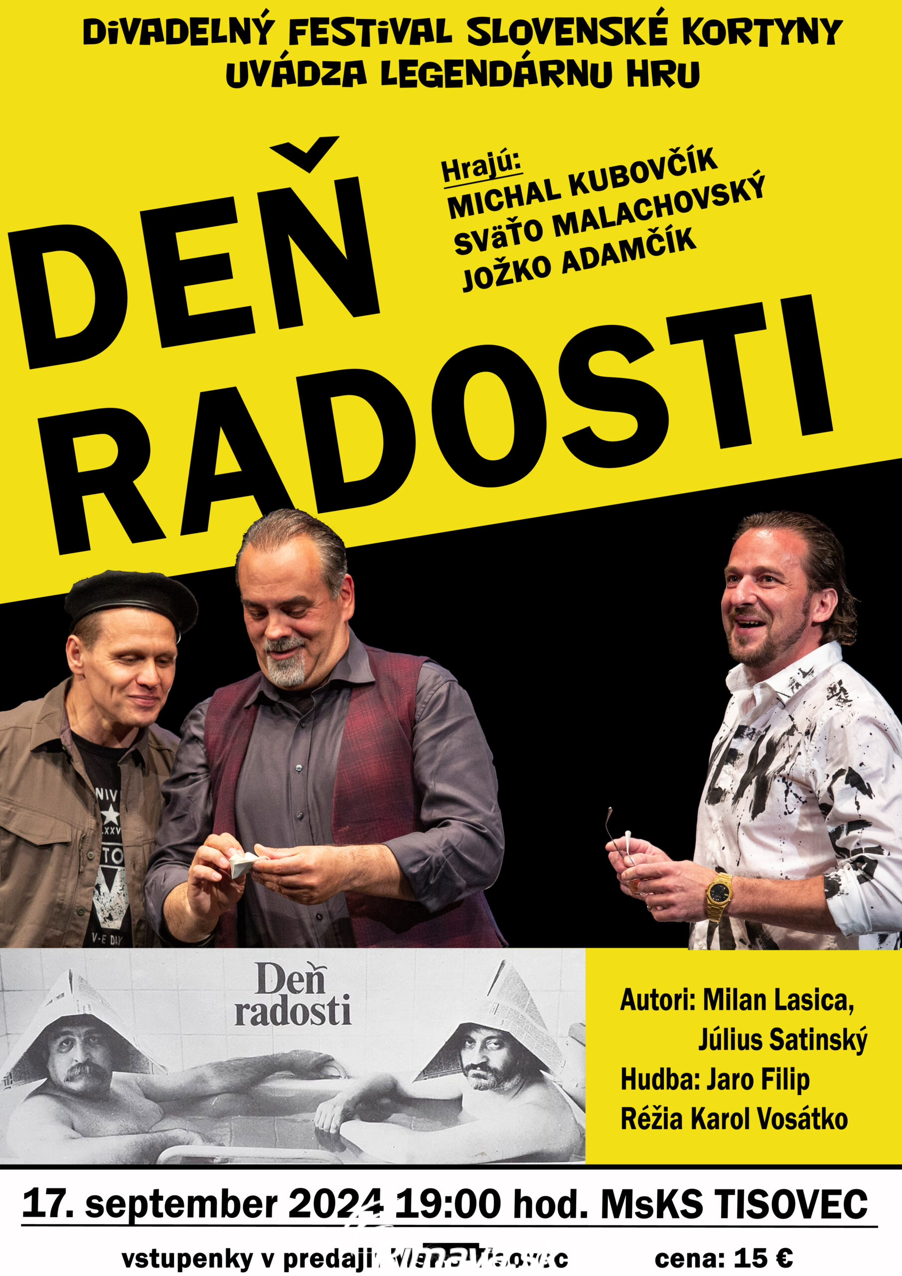V tejto sezóne vám do Tisovca prinesie Štúdio L+S s vynikajúcu divadelnú komédiu autorov Júliusa Satinského a Milana Lasicu „Deň radosti".