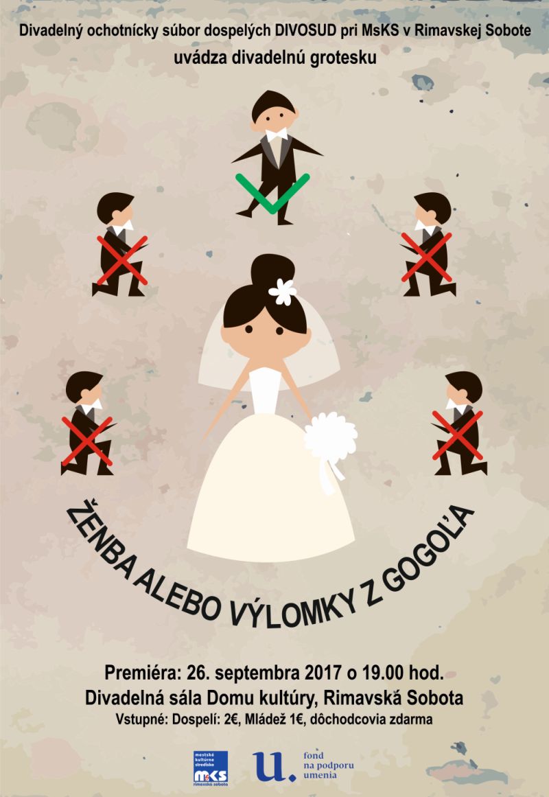 Všetkých milovníkov ochotníckeho divadla pozývame na premiéru divadelnej inscenácie Nikolaja Vasilijeviča Gogoľa „Ženba alebo výlomky z Gogoľa“ v podaní rimavskosobotského divadelného súboru DIVOSUD. Režisér Ľubo Šárik sa rozhodol po inscenácii či divadelnej adaptácii prózy Nos inscenovať Gogoľovu druhú komédiu v dvoch dejstvách. V grotesknej hre o malomeštianskom živote účinkujú: Terka Maksi, Hela Chrenková, Naďa Garayová, Roman Čarnoký, Robo Čapucha, Miro Kopec a Dušana Májošová. Scéna a kostýmy: Eva Weiterschützová. Vstupné: 2€ dospelí/ 1€ mládež / dôchodcovia zdarma. Inscenáciu z verejných zdrojov podporil Fond na podporu umenia.