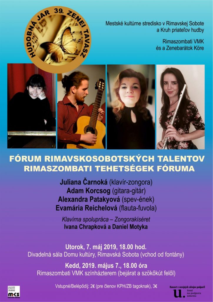 Pozývame Vás v utorok, 7. 5. 2019 o 18.00 hod. do divadelnej sály DK (vchod od fontány) na ďalší koncert v rámci 39. ročníka Hudobnej jari Fórum rimavskosobotských talentov. V programe budú účinkovať mladí umelci, absolventi miestnej Základnej umeleckej školy: Juliana Čarnoká / klavír, Adam Korcsog / gitara, Alexandra Patakyová /spev a Evamária Reichelová / flauta. Klavírna spolupráca: Daniel Motyka a Eva Čarnoká. Vstupné: 3€ / 2€ pre členov KPH, predaj vstupeniek na mieste. Projekt Hudobnej jari realizujeme s finančnou podporou z verejných zdrojov Fondu na podporu umenia, ktorý je aj hlavným partnerom podujatia.
