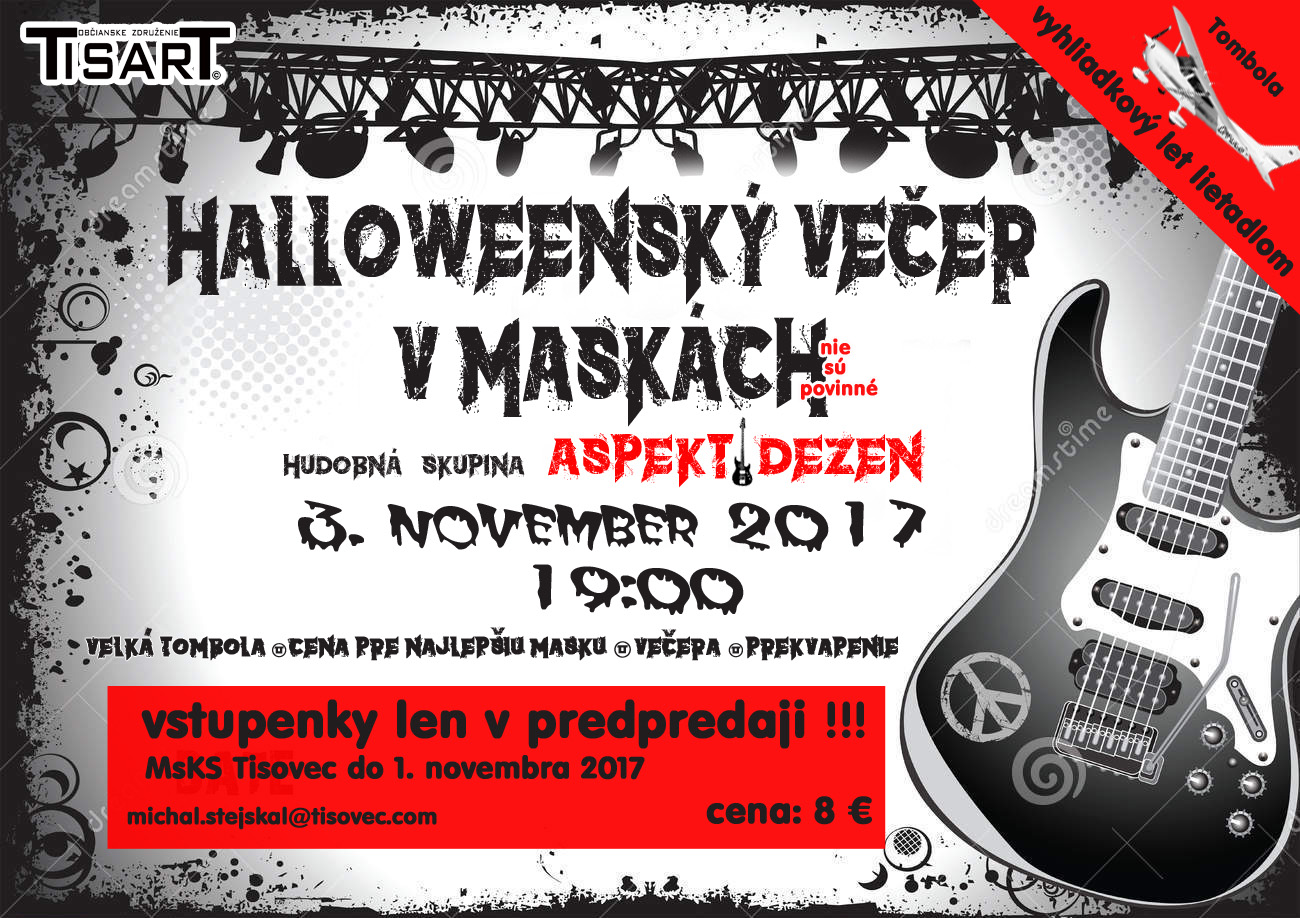Oddelenie KaŠ, Občianske združenie TisArt vás pozýva na Halloweenský večer v maskách, tanečná zábava sa uskutoční v piatok, 3. novembra o 19:00, v spoločenskej sále MsKS v Tisovci. Do tanca vám bude hrať hudobná skupina Aspekt z Tisovca. Čaká na vás bohatý program – cena za najlepšiu masku večera, veľká tombola, v ktorej hlavnou cenou je vyhliadkový let lietadlom, večera, a prekvapenie. Vstupné je 8 €.