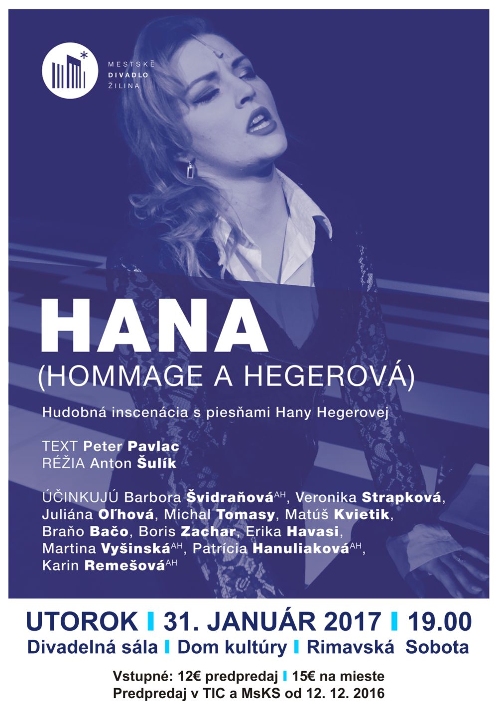 Hudobná inscenácia HANA je návratom žilinského divadla k väzbám, ktoré si ctí. Je veľkou poctou Hane Hegerovej, ktorá začínala svoju profesionálnu dráhu v päťdesiatych rokoch minulého storočia (1953-1958) práve na doskách žilinského divadla. Cez jej skladby, ktoré ukrývajú príbeh a tajomstvo, hovoria o vzťahoch a únikoch do intimity ticha a slov na hranici spievania.
