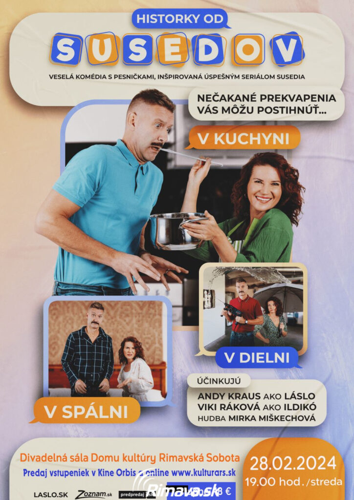 Pozývame vás 28. 2. 2024 o 19.00 hod. do divadelnej sály DK na vtipné divadelné predstavenie inšpirované úspešným seriálom Susedia, so známymi hercami Andym Krausom a Viki Rákovou. Vtipné dialógy, nečakané situácie, veľa zábavy, a to všetko bude novými pesničkami zloženými špeciálne pre toto predstavenie spájať a komentovať Mirka Miškechová. Vstupné: 18€, predaj vstupeniek v Kine Orbis a na www.kulturars.sk