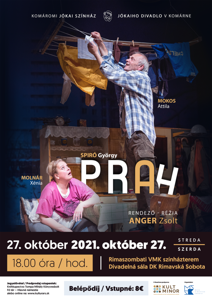 Všetkých milovníkov divadelného umenia pozývame v stredu, 27. októbra o 18.00 hod. v divadelnej sále DK na predstavenie Jókaiho divadla z Komárna s komédiou Györgya Spiróa PRAH. Vidiecky manželský pár roky sníva o tom, že vyhrá hlavnú cenu v športke. A stane sa! Ale čo s toľkými peniazmi...Vstupenky na predstavenie v hodnote 8€ si môžete zakúpiť v Kníhkupectve M. Tompu alebo online na stránke www.kulturars.sk. Predstavenie sa realizuje v OTP režime.Program z verejných zdrojov podporil Fond na kultúru národnostných menšín.