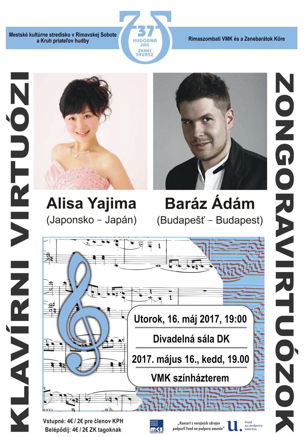 Alisa Yajima z Japonska a budapeštiansky klavirista Baráz Ádám. Koncert je súčasťou 37. Hudobnej jari. Vstupné: 4 €/ 2 € pre členov KPH, predaj vstupeniek v MsKS a na mieste. Koncert z verejných zdrojov podporil Fond na podporu umenia.