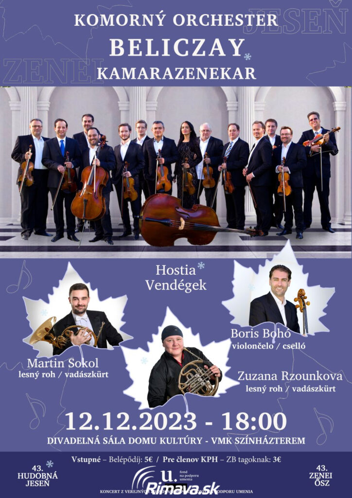 V utorok, 12. 12. o 18.00 hod. koncert Komorného orchestra Beliczay ukončí 43.ročník Hudobnej jesene v divadelnej sále DK Rimavskej Sobote. V programe, kde ako hostia vystúpia Zuzana Rzounková a Martin Sokol, vynikajúci českí hráči na lesnom rohu a koncertný majster skupiny violončiel Slovenskej filharmónie Boris Bohó, odznejú skladby od G .P. Telemanna, J. Haydna, A. Piazzolu a E. H. Griega.