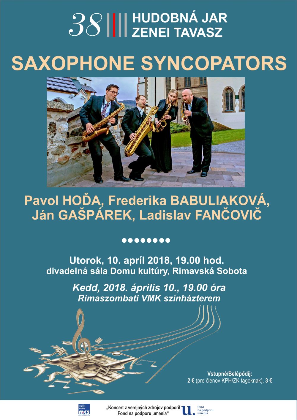 Všetkých milovníkov krásnej hudby pozývame v utorok, 10. apríl 2018 o 19.00 hod. do divadelnej sály DK na druhý koncert 38. ročníka Hudobnej jari v Rimavskej Sobote. SAXOPHONE SYNCOPATORS je unikátne saxofónové kvarteto, ktoré sa venuje interpretácii skladieb vážnej hudby, ktoré boli pre takéto nástrojové obsadenie skomponované. Účinkujú: Pavol Hoďa - soprán/alt saxofón, Ján Gašpárek - alt saxofón, Ladislav Fančovič - tenor saxofón, Frederika Babuliaková - barytón saxofón. Vstupné: 3€ / 2€ pre členov KPH. Predaj vstupeniek na mieste.