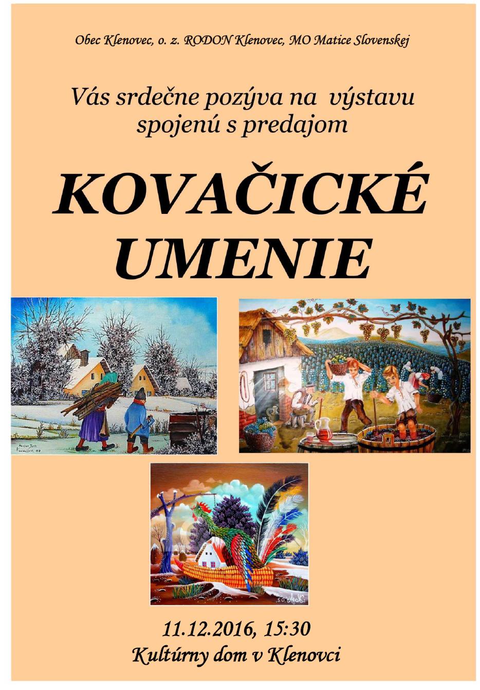 Prajem pekný deň, a v mene organizátorov Vás srdečne pozývam na vernisáž predajnej výstavy insitného umenia maliarov z Kovačice, Jána Žolnaja a Jozefa Havjara. Vernisáž sa uskutoční v nedeľu 11.12.2016 o 15:30 v rámci podujatia Pokoj ľuďom dobrej vôle, v Kultúrnom dome v Klenovci.
