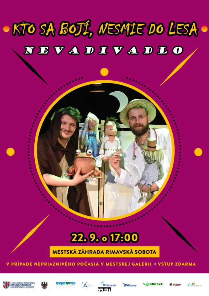Na záver Rozprávkových prázdnin 2024 prichádza do Mestskej záhrady NevaDIvadlo so vtipnou a veselou bábkovou inscenáciou KTO SA BOJÍ, NESMIE DO LESA, ktorá vznikla na motívy rozprávky Karla Čapka. Malých divákov pozývame v nedeľu, 22. 9. o 17.00 hod. do hustého tmavého lesa plného čarov a kúziel zavíta lekár. Prečo? Aby vyliečil strašidlá. Aj tie, ktoré z neho majú strach. Pomáhať všetkým, bez rozdielu, je totiž jeho práca. Príďte sa presvedčiť o tom, že strašidlá sa do moderného sveta už vôbec nehodia a že doktora sa nemusí báť nikto, dokonca ani najhrôzostrašnejší kúzelník Magiáš.