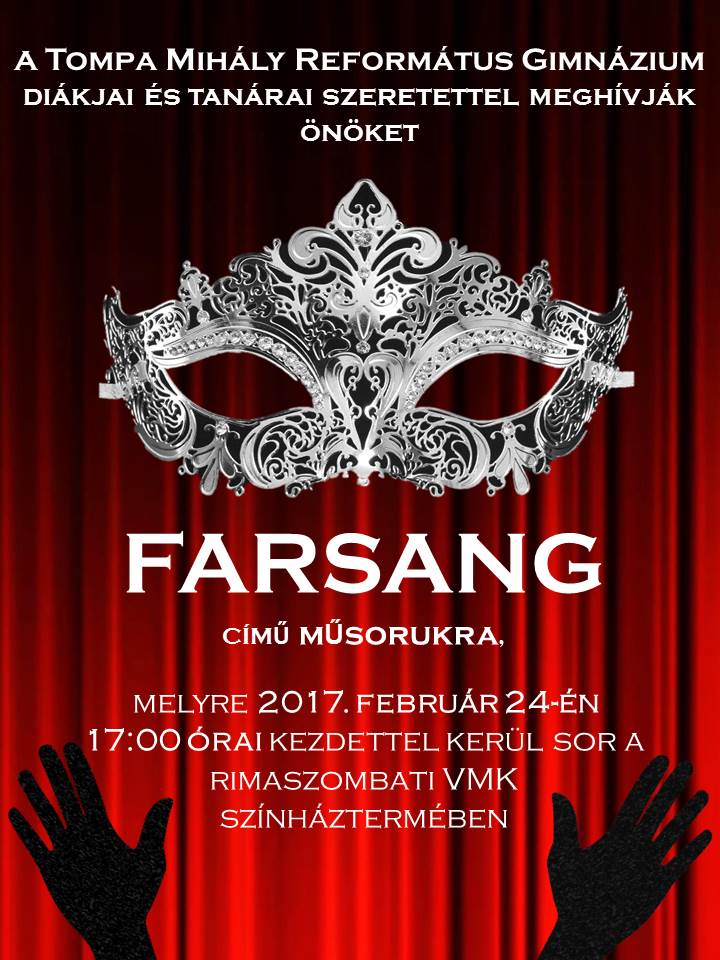 Jövő pénteken, február 24-én 17:00 órai kezdettel farsangi mulatságban lehet részük a Tompa Mihály Református Gimnázium tanulóinak közreműködésével. Mindenkit szeretettel várunk, akik már igazi farsangi hangulatban vannak.