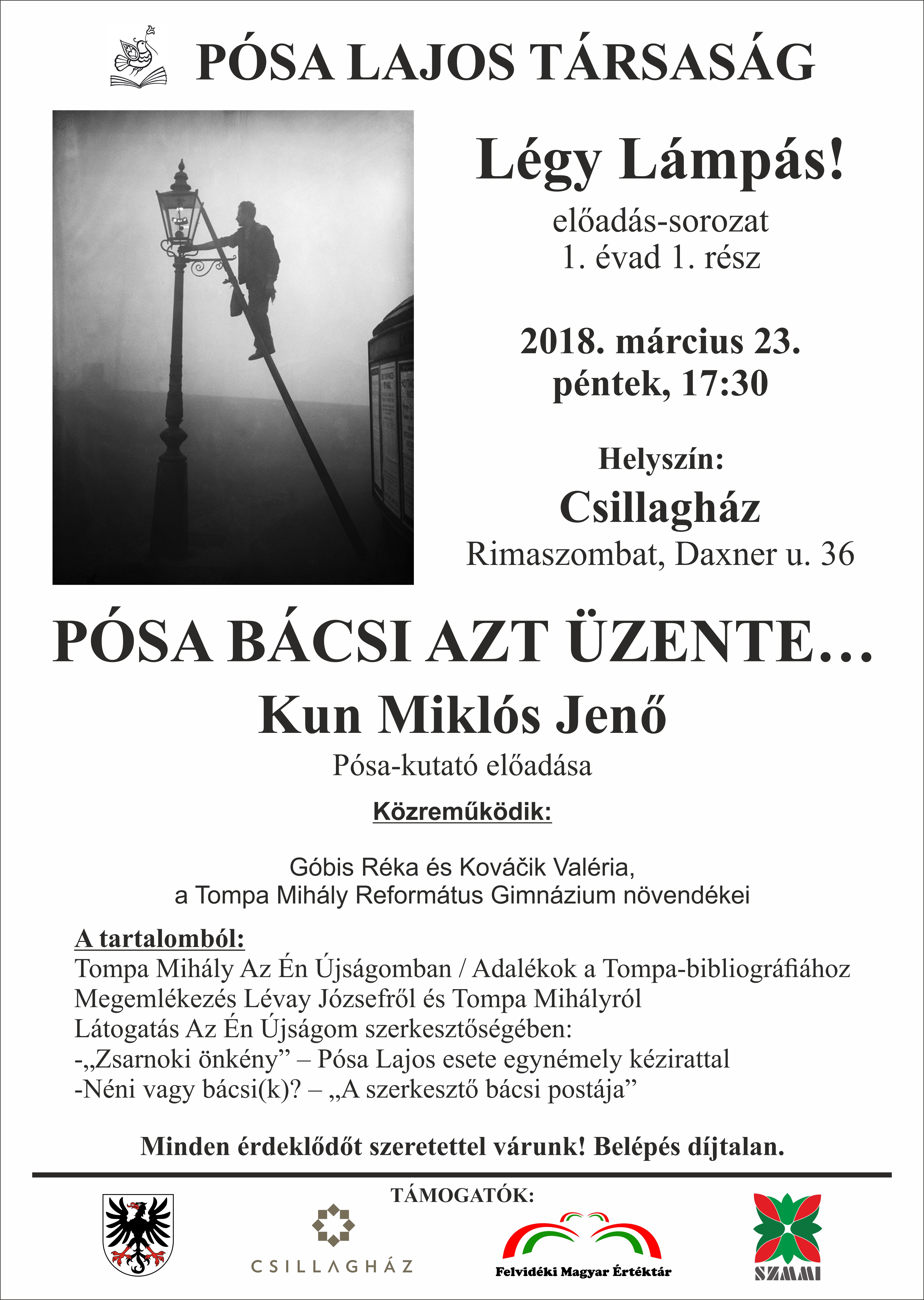 A Pósa Lajos Társaság március 23-án, pénteken 17.30 kezdettel szervezi meg Kun Miklós Jenő, Pósa-kutató "Pósa bácsi azt üzente..." című előadását a rimaszombati Csillagházban.