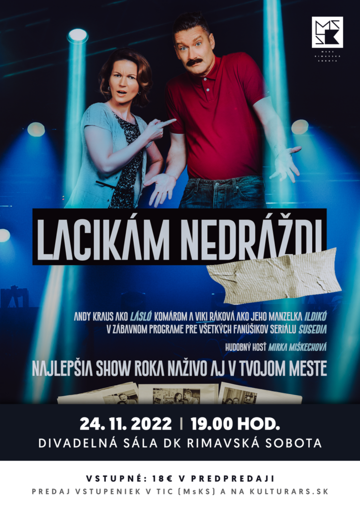 Andy Kraus a Viki Ráková sa v zábavnej show "Lacikám nedráždi" predstavia v stredu, 24. 11. o 19:00 hod. v obľúbených komediálnych postavách Lászla a Ildikó, ktoré poznáte z najúspešnejšieho slovenského sitcomu SUSEDIA.