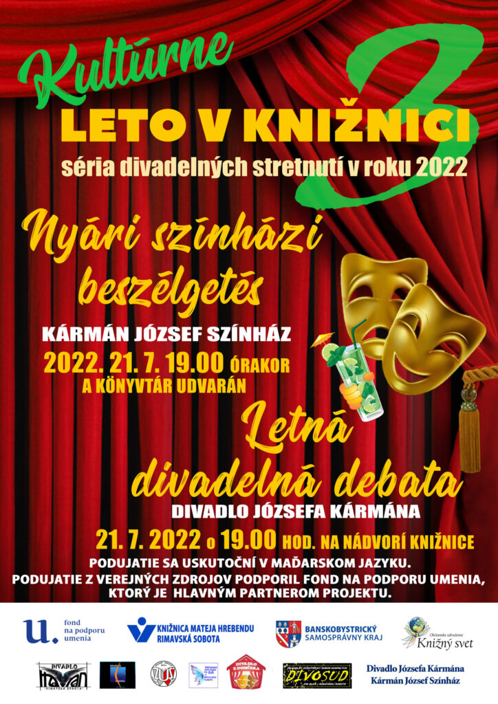 Srdečne Vás pozývame na predstavenie Letná divadelná debata-Nyári színházi beszélgetés, ktoré sa uskutoční dňa 21. Júla 2022 o 19:00 hod. na nádvorí knižnice. Hudobno-divadelné predstavenie, počas ktorého odznejú rôzne kabaretné piesne v dramatickom prevedení, staré maďarské hity i rôzne pesničky z jednotlivých filmov. Hudobný kabaretný program sa uskutoční v maďarskom jazyku. Podujatie sa realizuje v rámci projektu Kniha v srdci, srdce v knihe 4 s finančnou podporou Fondu na podporu umenia.