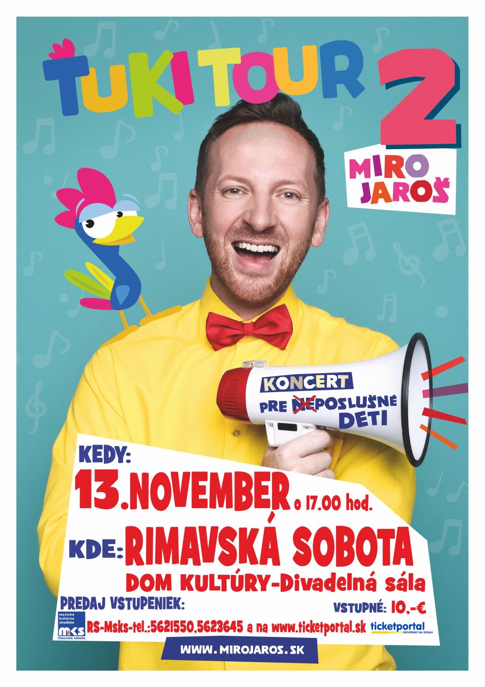 Po úspešnom, minuloročnom Ťuki tour, pripravil Miro Jaroš so svojou kapelou nový program pre deti a ich rodičov. V pondelok, 13. 11. sa v rámci svojho jesenného turné zastaví u nás v Rimavskej Sobote. Koncert bude o 17.00 hod. v divadelnej sále DK. Nebudú chýbať najznámejšie hity, ani skladby z albumu Pesničky pre (ne)poslušné deti 2. Príďte si s Mirom zatancovať na Šteniatko, Ham Ham stájl či Moje telo alebo snívať pri Ceste do rozprávky! Hlasné spievanie je vítané! Po koncerte bude autogramiáda a fotenie s Mirom aj kohútikom Ťukim. Pri odchode dostanú malí neposlušníci darček:) Vstupné: 10€, predaj vstupeniek v MsKS, TIC a cez Ticketportal už teraz.
